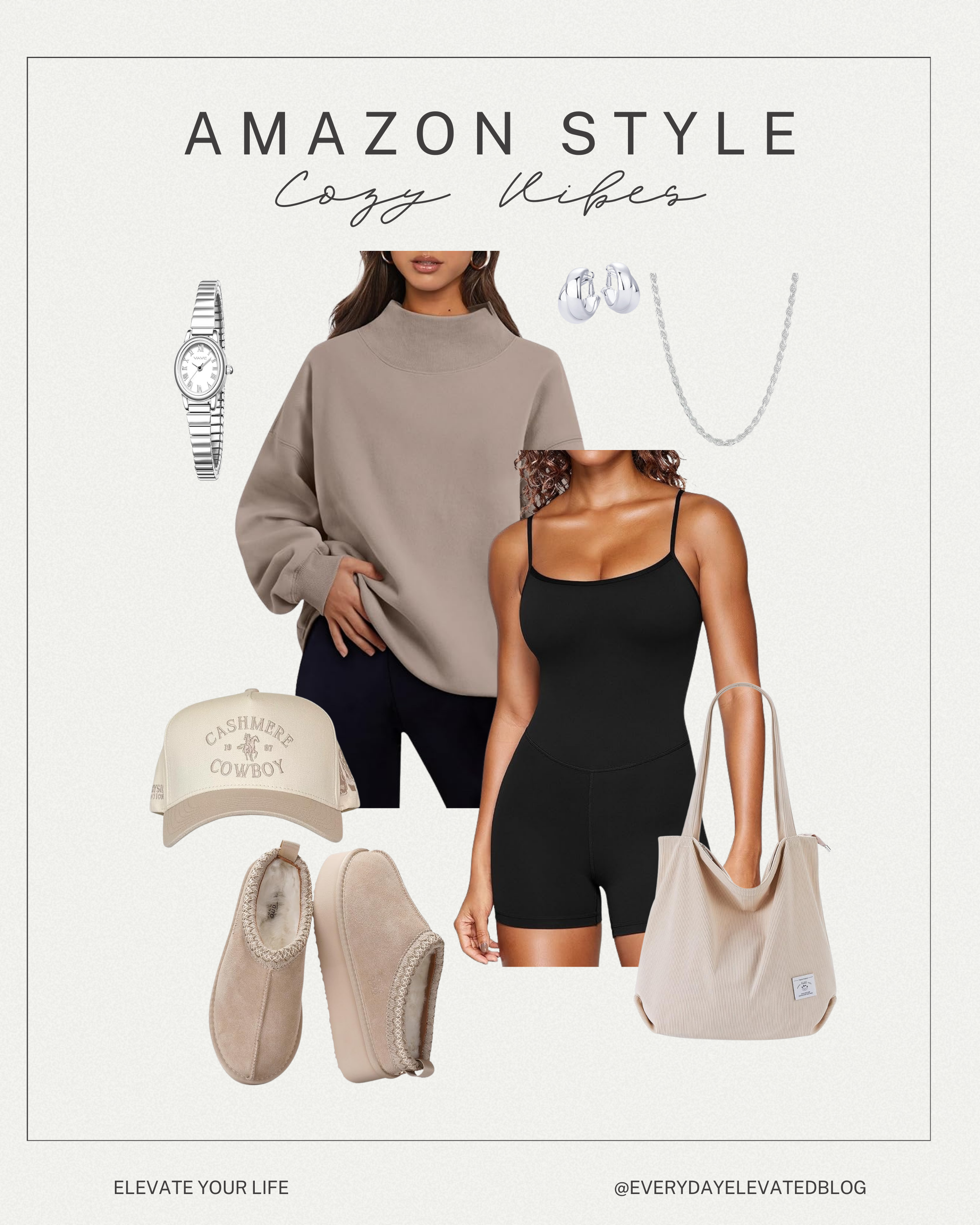 This look is the perfect mix of comfort and style. The fitted romper balances the oversized sweatshirt, while the neutral accessories keep everything looking polished and intentional.